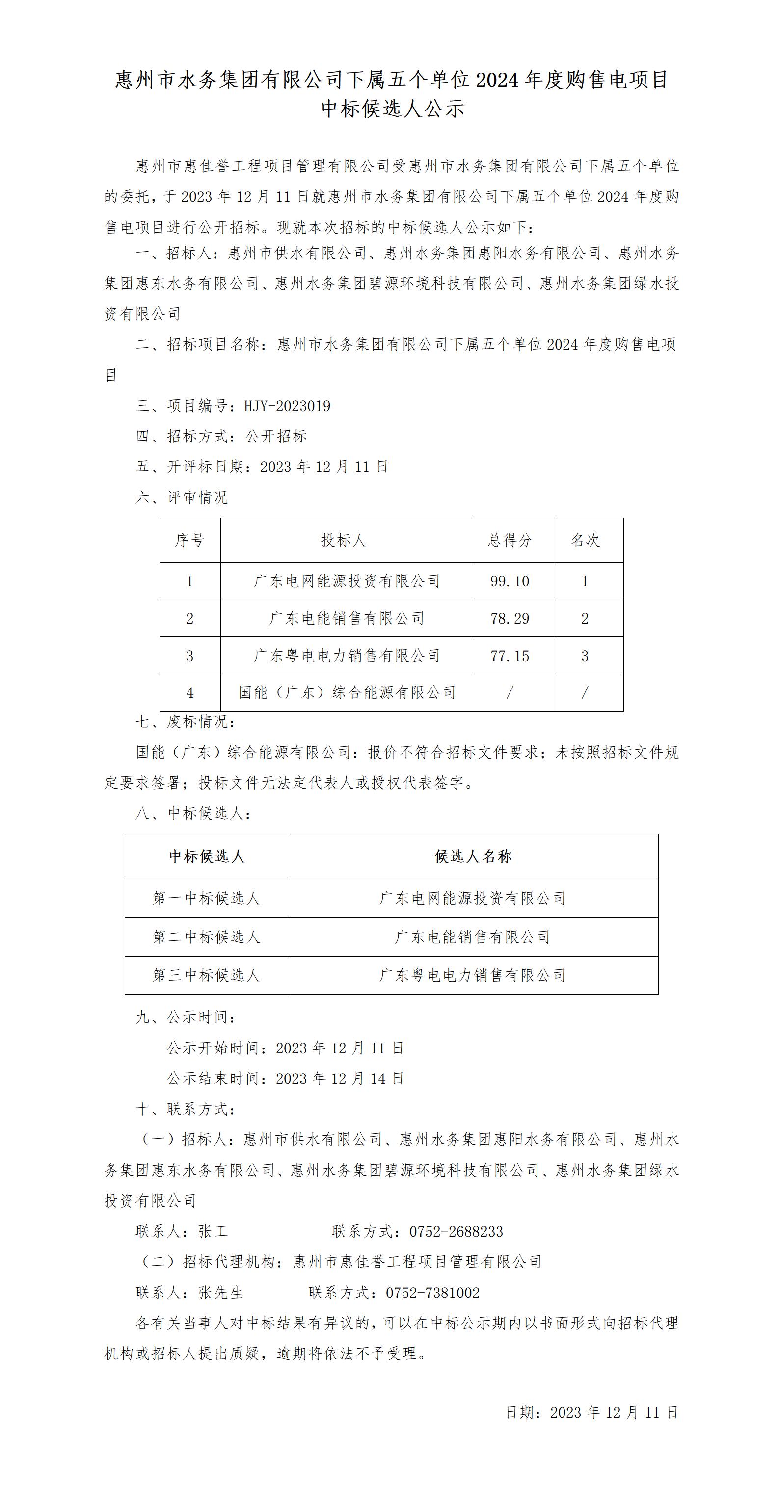 惠州市水務集團有限公司下屬五個單位2024年度購售電項目中標候選人公示