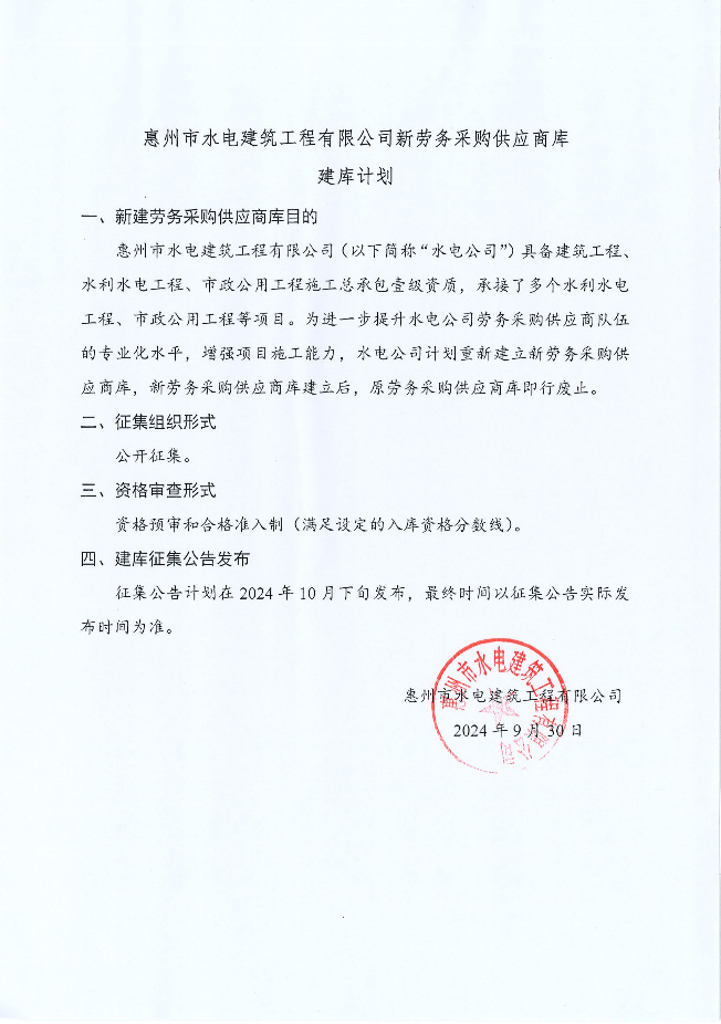 惠州市水電建筑工程有限公司新勞務(wù)采購供應(yīng)商庫建庫計(jì)劃