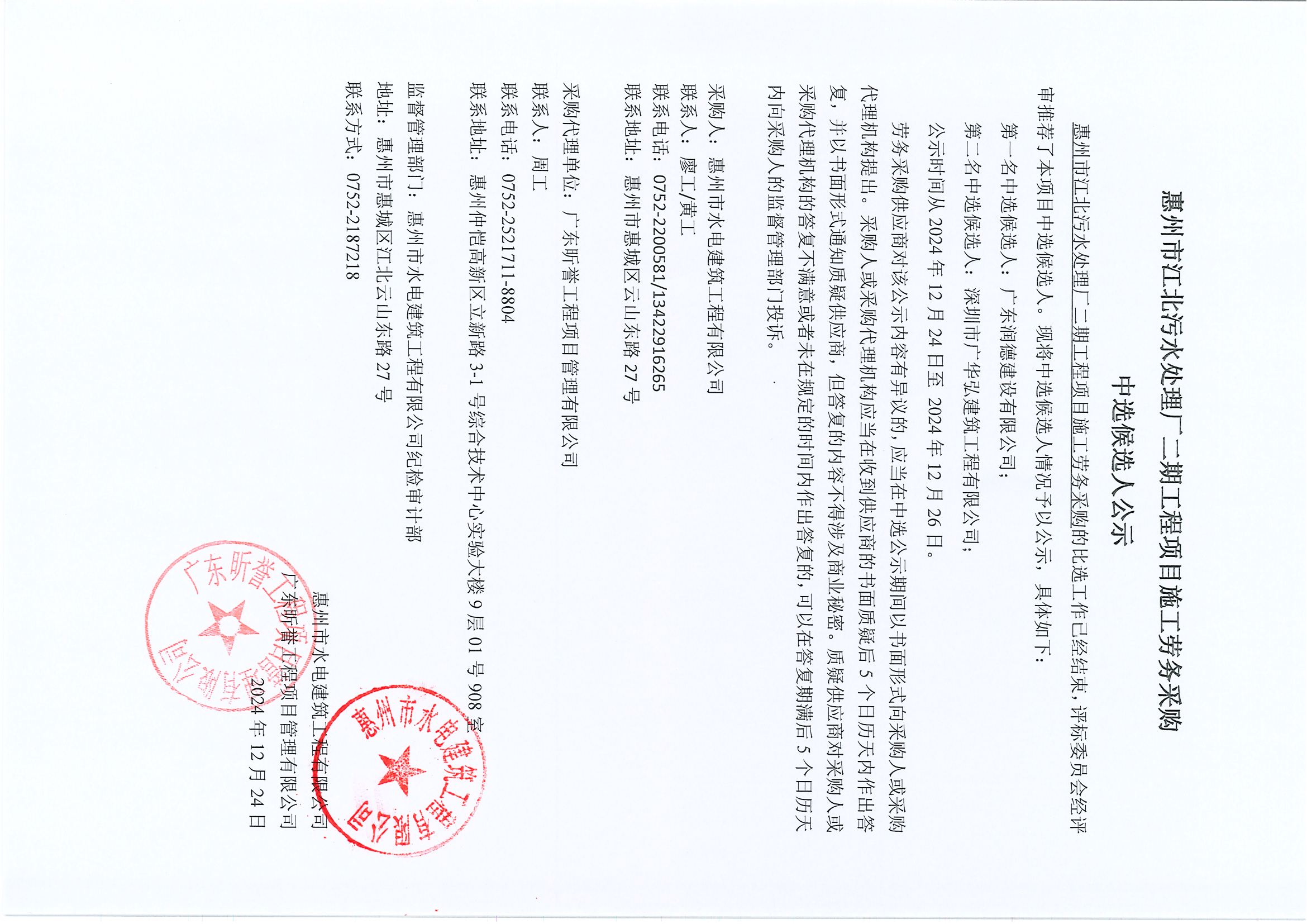 惠州市江北污水處理廠二期工程項(xiàng)目施工勞務(wù)采購(gòu)中選候選人公示