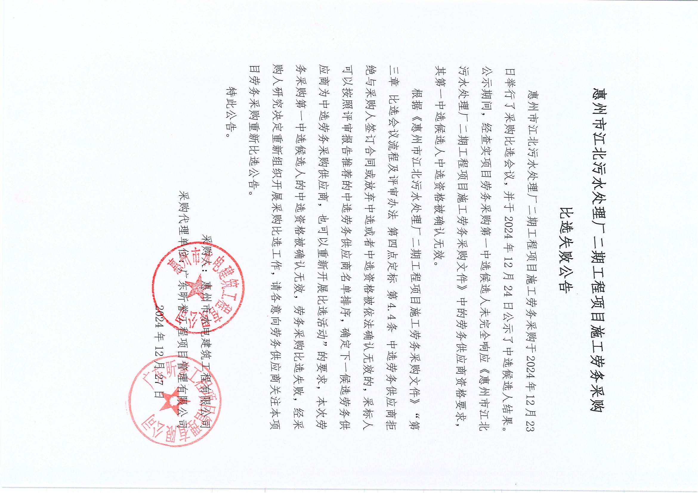 惠州市江北污水處理廠二期工程項目施工勞務采購比選失敗公告