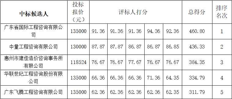2、參與項目評標(biāo)環(huán)節(jié)的投標(biāo)企業(yè)名單:廣東省國際工程咨詢有限公司、中量工程咨詢有限公司、廣東飛騰工程咨詢有限公司、華聯(lián)世紀工程咨詢股份有限公司、惠州市建佳造價咨詢事務(wù)所有限公司、華聯(lián)世紀工程咨詢股份有限公司。
