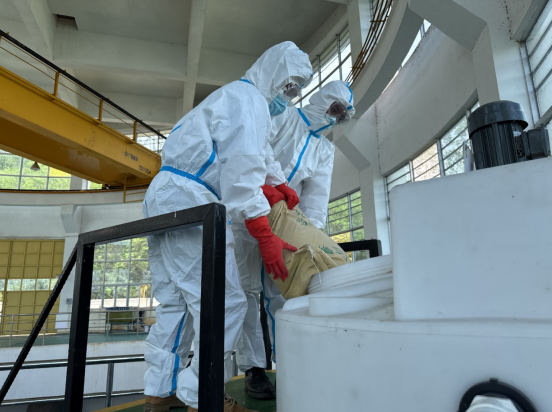 此次演練圍繞原水油跡污染及pH異常偏低兩個場景展開。演練中,發(fā)現(xiàn)“取水口出現(xiàn)少量油跡污染”后,吸水泵房巡檢人員立即上報并警戒現(xiàn)場,應急小組迅速攜帶攔油網(wǎng)、吸油毯趕赴現(xiàn)場,30分鐘內完成油污攔截與吸附,快速控制污染。隨后模擬原水pH值為6.3時,吸水泵房應急加藥系統(tǒng)迅速啟動,現(xiàn)場處置組協(xié)同配置藥劑、調試設備,精準投加調節(jié),不到1小時即讓水質穩(wěn)定在安全范圍。演練過程中,吸水泵房作為一線處置陣地,及時啟動應急預案,確保取水水質符合生產要求。同時,將觀洞水庫作為備用水源隨時待命,形成“即戰(zhàn)即防”的堅實防線。