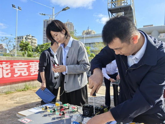 電路接線賽場同樣扣人心弦,參賽選手們屏氣凝神、全神貫注,紅綠黃黑四色電線在指尖靈活穿梭,剝線、接線、布線每一步操作都展現(xiàn)出扎實(shí)的專業(yè)功底。其中,江北水廠鐘考敏、李玥佳組成的男女搭檔更是成為全場焦點(diǎn),二人沉著應(yīng)戰(zhàn)、緊密協(xié)作,最終以14分13秒、96.2分的優(yōu)異成績摘得該項(xiàng)目一等獎(jiǎng)。