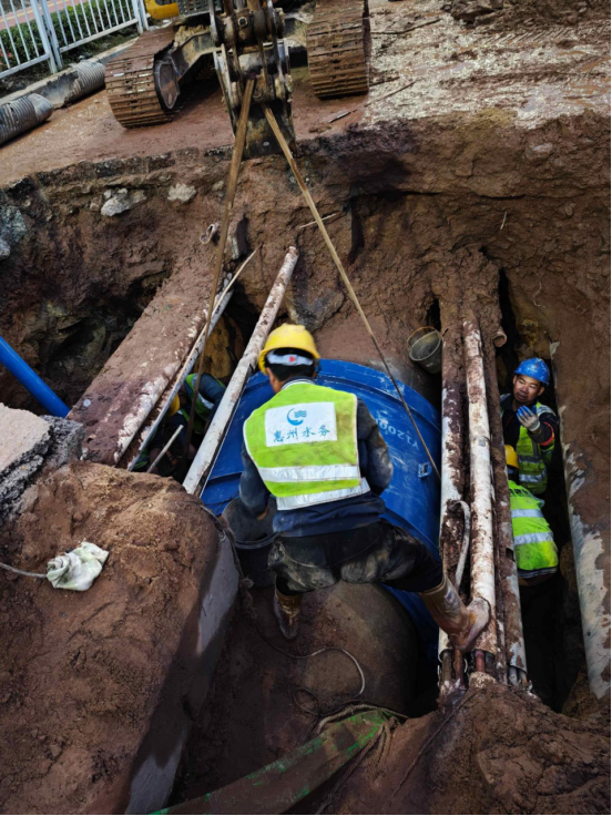 漏點鎖定,但難題也擺在了維修人員面前:目標(biāo)管道上方的燃?xì)夤芘c高壓電纜管,如同懸在頭頂?shù)摹袄麆Α?,留給搶修作業(yè)的凈空不足一米。任何不當(dāng)?shù)拈_挖或震動都可能引發(fā)不可預(yù)知的連鎖風(fēng)險。 “這是管道‘心臟’區(qū)域的精細(xì)手術(shù),不能有毫厘之差?!笔泄┧狙杆賲f(xié)調(diào)仲愷交通事務(wù)中心、仲愷交通路政股、惠環(huán)交警中隊、燃?xì)狻㈦娏?、通信等部門,取得施工許可與協(xié)同保障后,制定了“不停水、微創(chuàng)開挖、快速夾堵”的搶修方案。