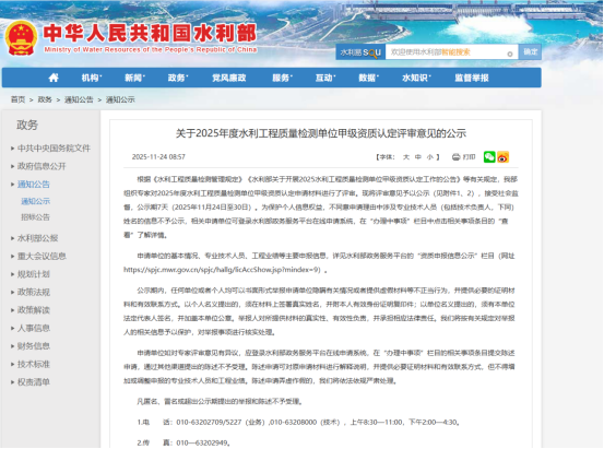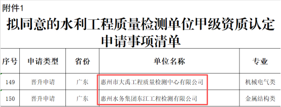 近日,水利部2025年度水利工程質(zhì)量檢測單位甲級資質(zhì)認定評審結果公示,惠州水務集團下屬大禹檢測公司、東江檢測公司雙雙傳來捷報,資質(zhì)建設實現(xiàn)里程碑式突破。