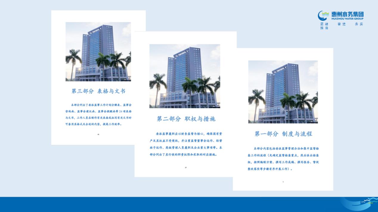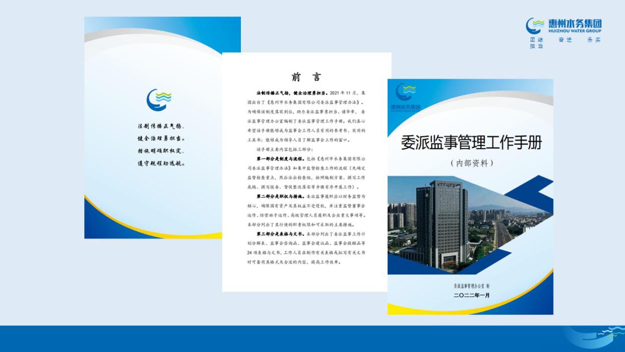 會(huì)上,與會(huì)人員對(duì)近期重點(diǎn)工作、監(jiān)事會(huì)運(yùn)作及《委派監(jiān)事管理工作手冊(cè)》等進(jìn)行了探討?!段杀O(jiān)事管理工作手冊(cè)》是為確保2021年11月集團(tuán)出臺(tái)的《惠州市水務(wù)集團(tuán)有限公司委派監(jiān)事管理辦法》落實(shí)到位,助力委派監(jiān)事勇?lián)?dāng)、譜華章,由集團(tuán)監(jiān)察審計(jì)部負(fù)責(zé)編制的,該手冊(cè)主要內(nèi)容包括制度、流程、職權(quán)、措施、表格、文書等。